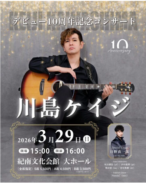 和歌山県みなべ町出身のシンガー・ソングライター川島ケイジさんが、デビュー10周年記念コンサートを開催されます。
